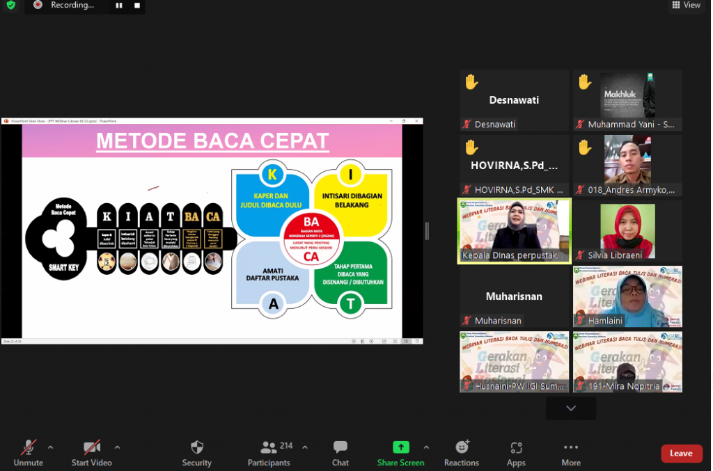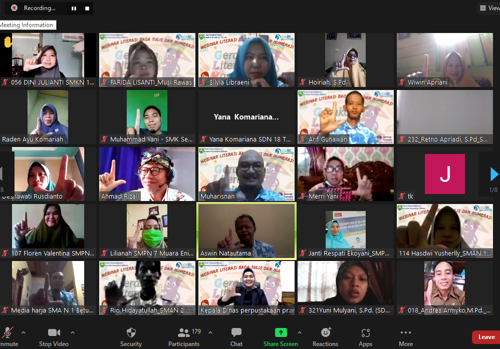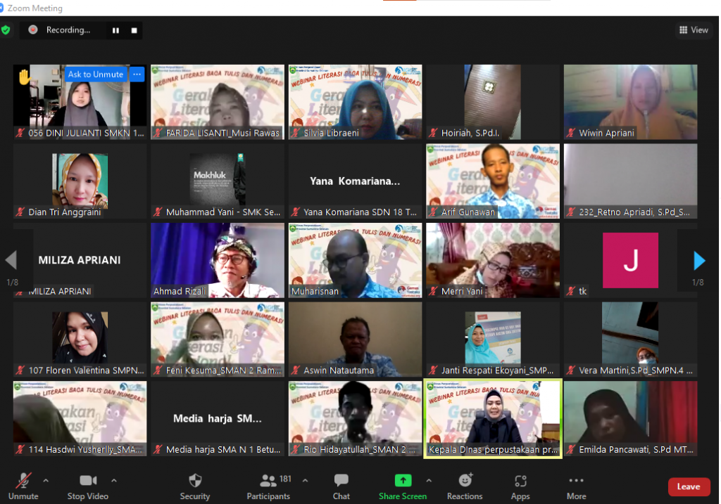 Kegiatan webinar ini menghadirkan dua narasumber yang sangat berkompeten dibidangnya. Pertama Kepada Dinas Perpustakaan Provinsi Sumatera Selatan, Fitriana., S.Sos., M.Si. dengan materi Memahami Pentingnya Literasi Baca Tulis Bagi Anak. Literasi baca tulis penting karena sebagai kunci mempelajari ilmu pengetahuan, meningkatkan kemampuan berbahasa dan memperkaya kosa kata,” terangnya.