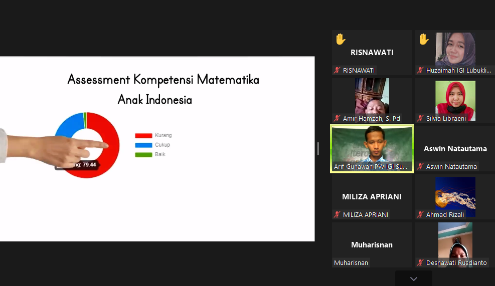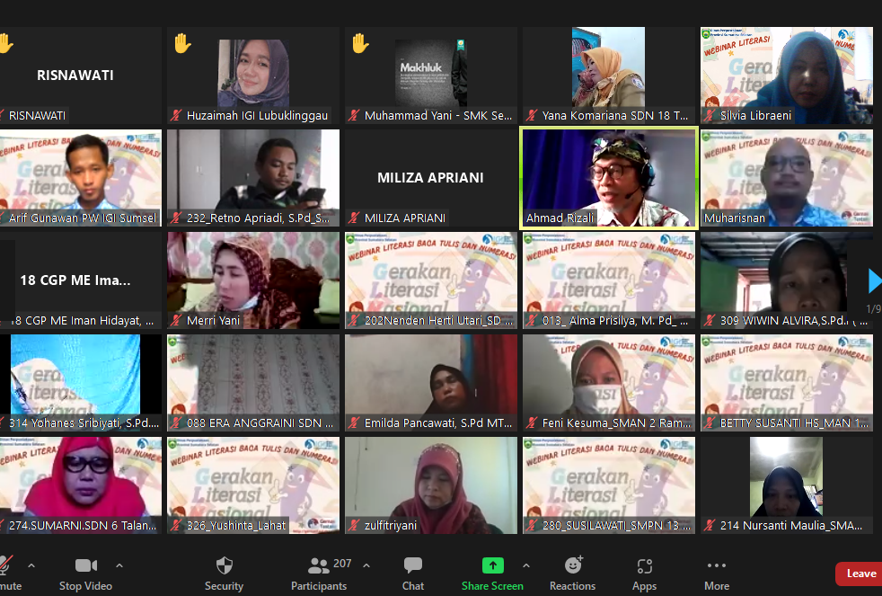 Sumatera Selatan, IGI.OR.ID- Webinar perdana yang digelar Ikatan Guru Indonesia (IGI) Sumatera selatan (IGI) Sumsel sukses digelar melalui aplikasi zoom, Senin (30/8). Ketua Wilayah IGI Sumsel, Aswin, S.Pd., M.Si. mengatakan, Webinar dengan tema literasi baca tulis dan numerasi diikuti dengan antusias oleh 203 peserta. “Sebenarnya peserta yang terdaftar dalam webinar ini ada 331 namun karena kendala jaringan peserta maka yang bisa mengikuti dengan baik sebanyak 203 peserta,” ujarnya.