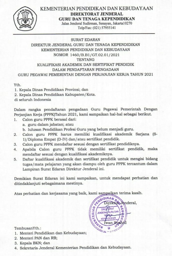 Sesuai dengan Surat Edaran Direktur Jenderal Guru dan Tenaga Kependidikan Kementerian Pendidikan dan Kebudayaan, Iwan Syahril Nomor 1460/B.B1/GT.02.1/2021 tentang Kualifikasi Akademik dan Sertifikat Pendidik dalam Pendaftaran Pegawai Pemerintah dengan Perjanjian Kerja (PPPK) Tahun 2021 maka calon guru PPPK berasal dari guru dalam jabatan atau lulusan Pendidikan Profesi Guru yang belum menjadi guru dengan kualifikasi akademik …